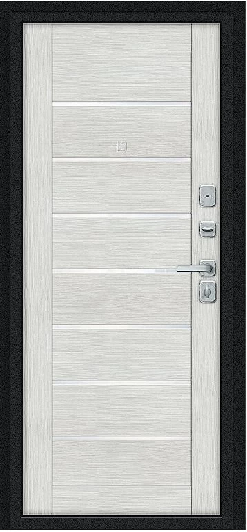 Надежная входная Дверь Браво Техно/BChrome Букле черное/Bianco Melinga премиум класса по цене 34 167 руб. Большая толщина стали защитит от проникновения в ваш дом, квартиру или коттедж. Используется очень качественная фурнитура: замки, цилиндры, ручки, защелки. Покрытие и отделка двери изготовлено под внимательным контролем производителя. Дверь имеет долгий срок службы и гарантию.